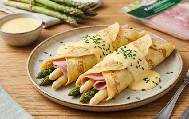 Rest fein hacken und unter die Soße rühren. Katenschinken würfeln. Je 3 Spargelstangen in je einen Crêpe wickeln. In eine flache Auflaufform setzen. Kerbel-Hollandaise darüber gießen und mit dem Schinken bestreuen.